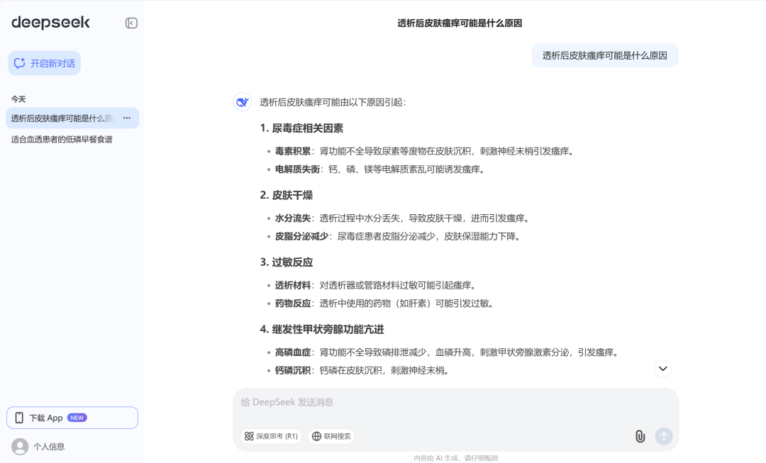 例如,輸入“透析后皮膚瘙癢可能是什么原因”,DeepSeek會列出可能的誘因,如高磷血癥、過敏反應等。