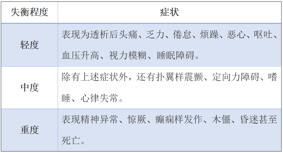 不同程度的透析“失衡綜合征”癥狀表現(xiàn)如下: