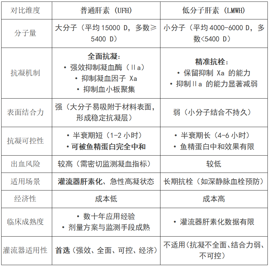 灌流器內的凝血反應是 “全鏈條激活”,既需要抑制Xa因子阻斷凝血啟動,更需要強效抑制凝血酶(Ⅱa)阻止血栓形成。普通肝素能同時覆蓋這兩個環節,而低分子肝素對Ⅱa的弱抑制作用,難以應對灌流器內的“強凝血壓力”。